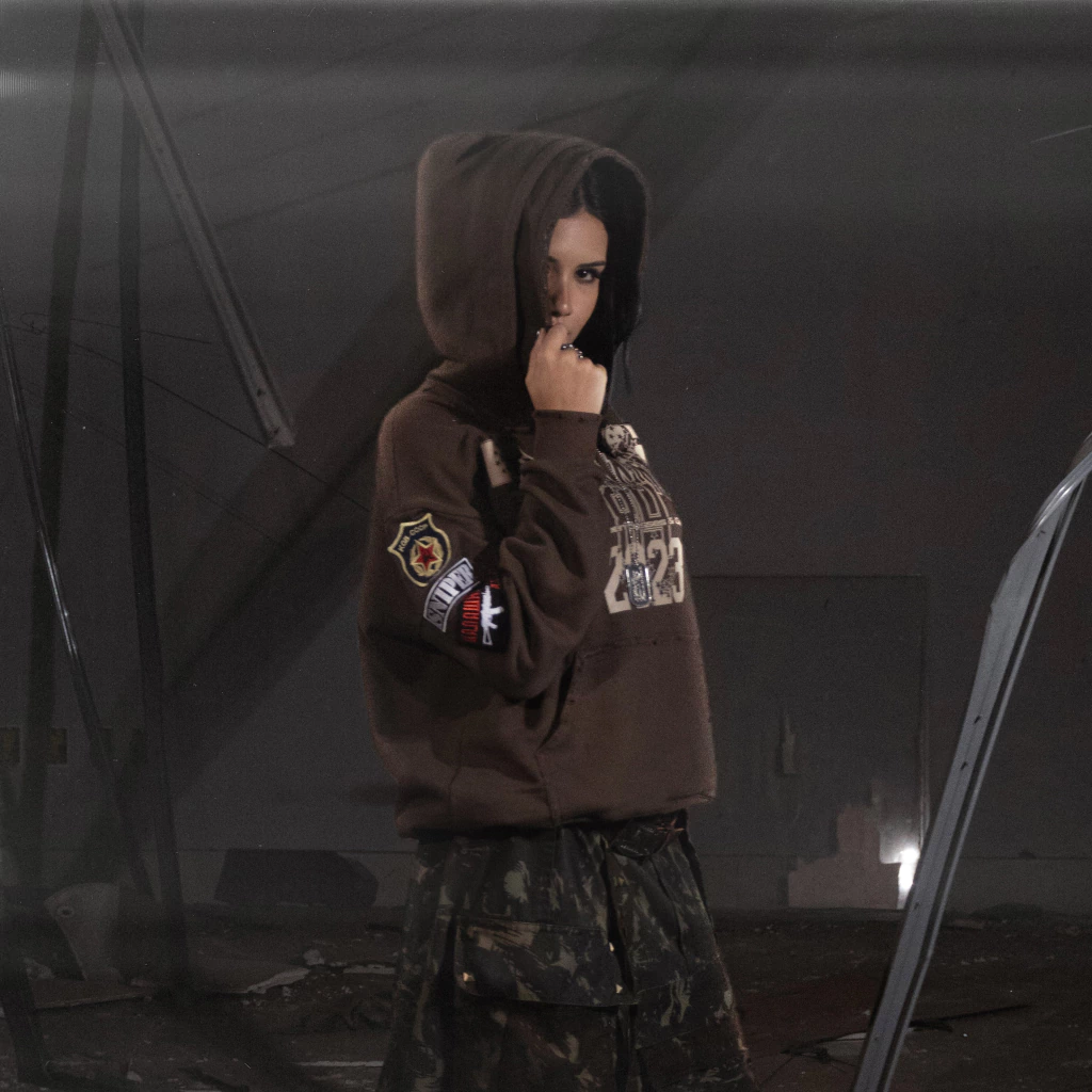 Patches bordados aplicados nos braços da peça.