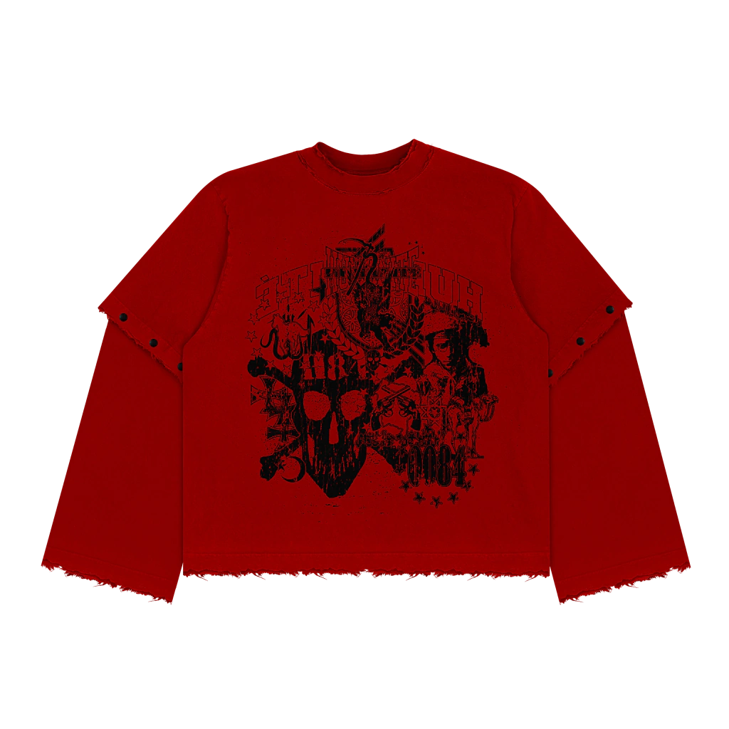 Camiseta em modelagem boxy com mangas duplas em camada, sendo a manga longa removível através dos botões.